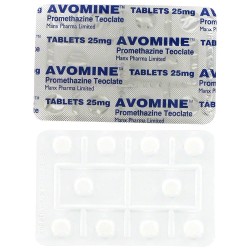You can buy Avomine (promethazine theoclate) tablets online to successfully treat symptoms of travel sickness. Avomine achieves this by blocking the function of histamines inside the body. As the active ingredient promethazine is an antihistamine, it can inhibit the normal function of histamines in conjunction with motion sickness, which is to cause the body to feel nauseas and possibly vomit. In doing so the medication can alleviate travel sickness caused by boat (sea sickness), plane, train and car travel. Avomine is taken orally in the form of a 25mg tablet.